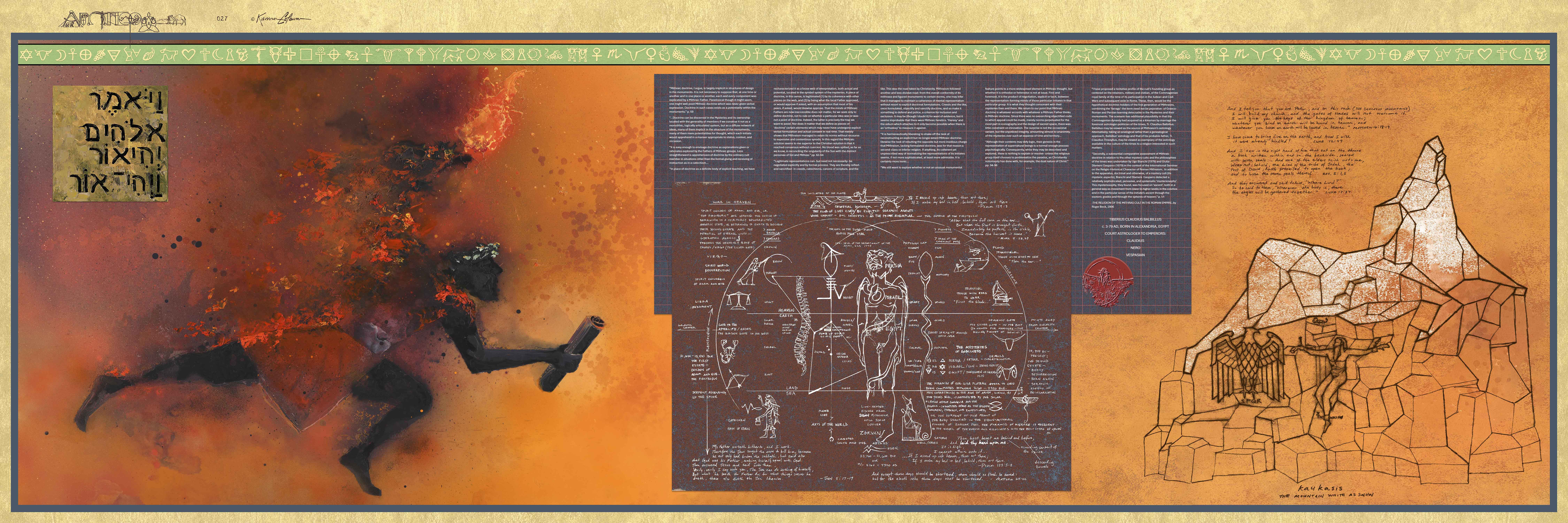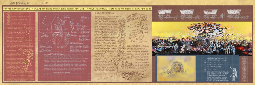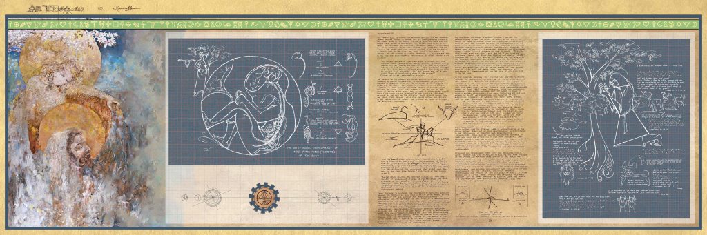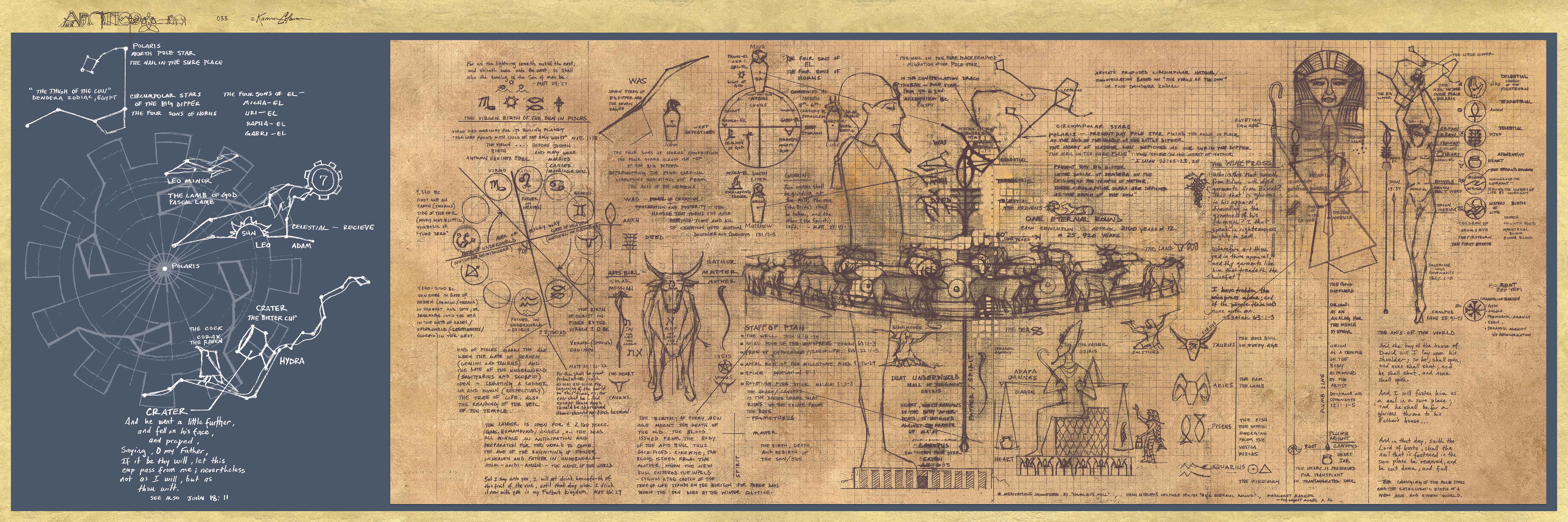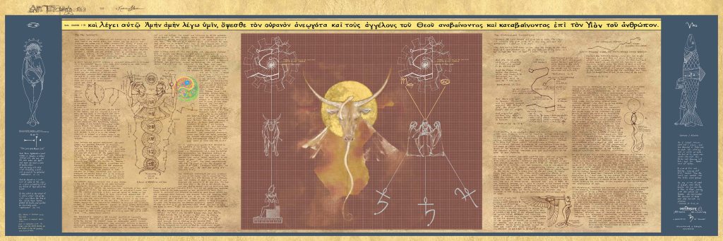 Understanding beyond my own religious tradition was often greatly accelerated by explanatory visions and transmissions of whole thoughts, often when I was about to wake from sleep or while drawing. When I find I was wrong about a detail in a drawing or painting, I have tried to correct it as best I can after research. I have tried to demonstrate a little about what this process can look like by showing the “blueprint” of a painting alongside the finished work. My primary source is the canonized scriptures of the Holy Bible and my personal belief in the divinity of Jesus Christ. The significance of the Doctrine and Covenants, (a canonized scripture of The Church of Jesus Christ of Latter-day Saints and other Mormonism movements) to this work came as a complete and indispensable surprise. I am an active member of The Church of Jesus Christ of Latter-day Saints. I am a member of said church because it is a carrier of the mystery, and it is where my people are. This work, however, does not speak for or about the Church. It is my own opinion and, I presume, will be completely unfamiliar to any official practice, tradition, or curriculum of the ecclesiastical church. It is primarily a work of imagination to demonstrate the process of syncretization and astronomical conceptualization that contributed to the formation of the Christian gospel. Such a process should produce infinite variations of the Christian mystery.
