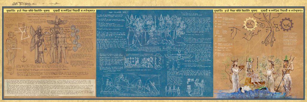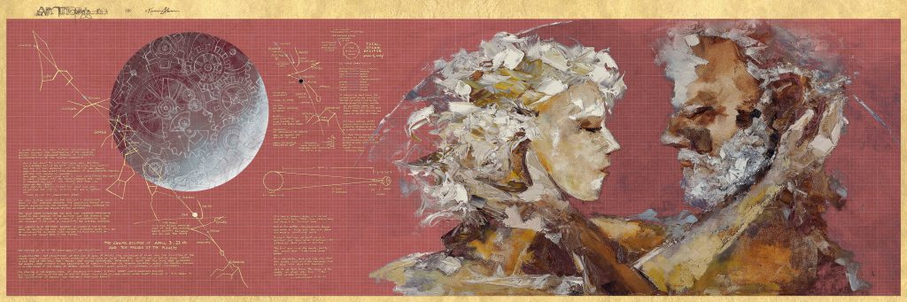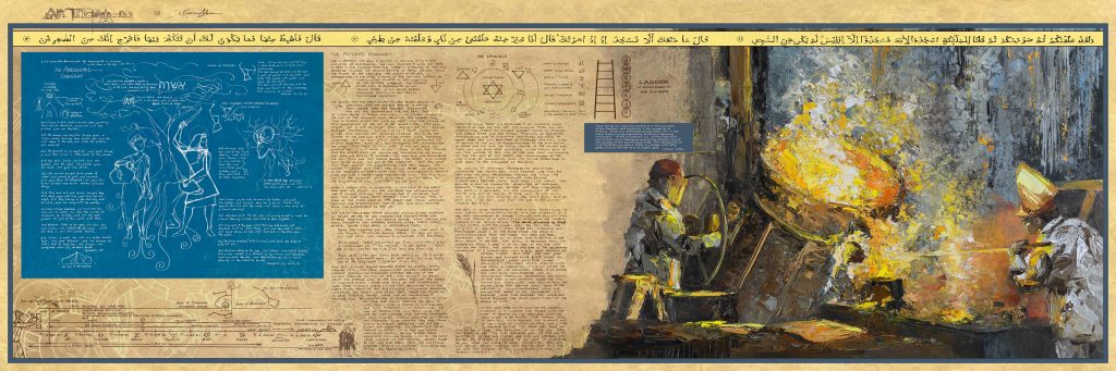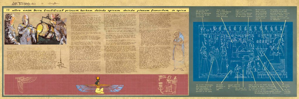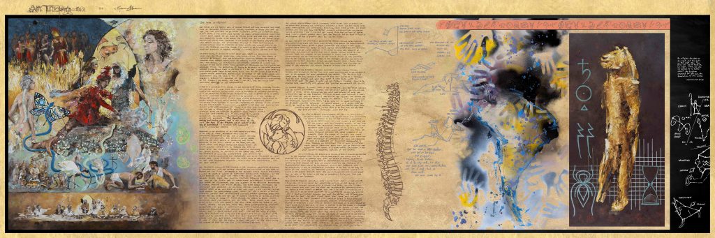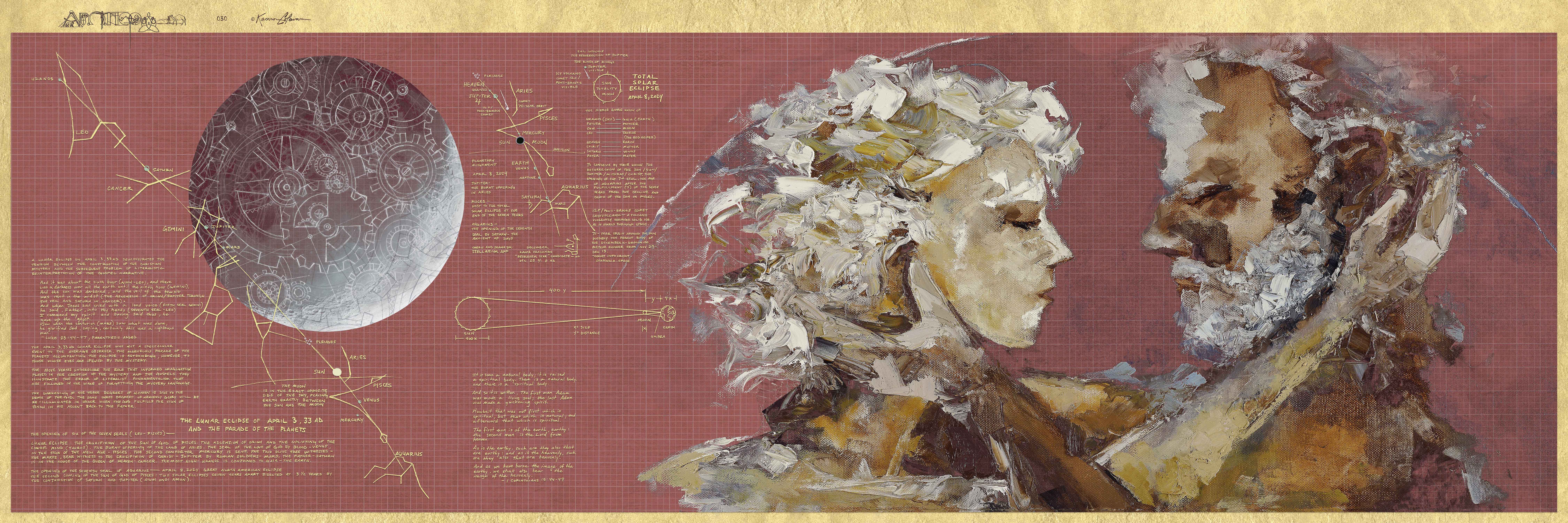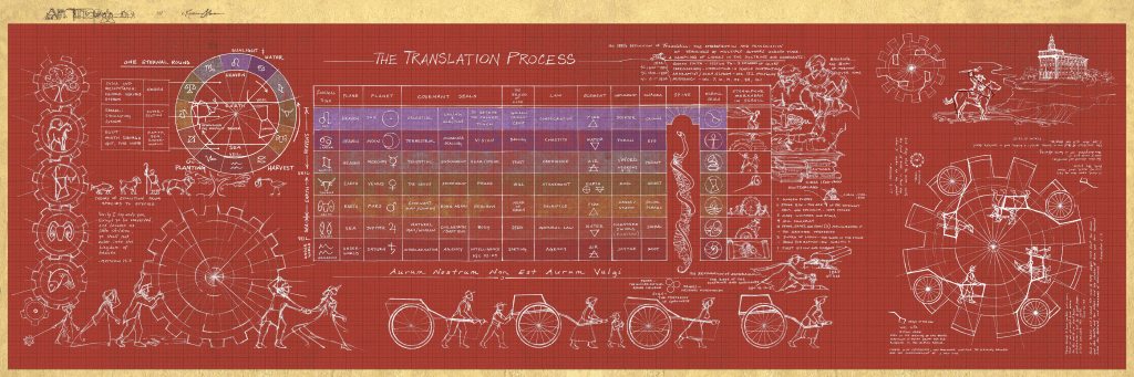 Understanding beyond my own religious tradition was often greatly accelerated by explanatory visions and transmissions of whole thoughts, often when I was about to wake from sleep or while drawing. When I find I was wrong about a detail in a drawing or painting, I have tried to correct it as best I can after research. I have tried to demonstrate a little about what this process can look like by showing the “blueprint” of a painting alongside the finished work. My primary source is the canonized scriptures of the Holy Bible and my personal belief in the divinity of Jesus Christ. The significance of the Doctrine and Covenants, (a canonized scripture of The Church of Jesus Christ of Latter-day Saints and other Mormonism movements) to this work came as a complete and indispensable surprise. I am an active member of The Church of Jesus Christ of Latter-day Saints. I am a member of said church because it is a carrier of the mystery, and it is where my people are. This work, however, does not speak for or about the Church. It is my own opinion and, I presume, will be completely unfamiliar to any official practice, tradition, or curriculum of the ecclesiastical church. It is primarily a work of imagination to demonstrate the process of syncretization and astronomical conceptualization that contributed to the formation of the Christian gospel. Such a process should produce infinite variations of the Christian mystery.